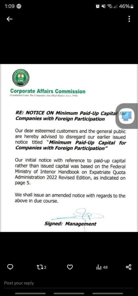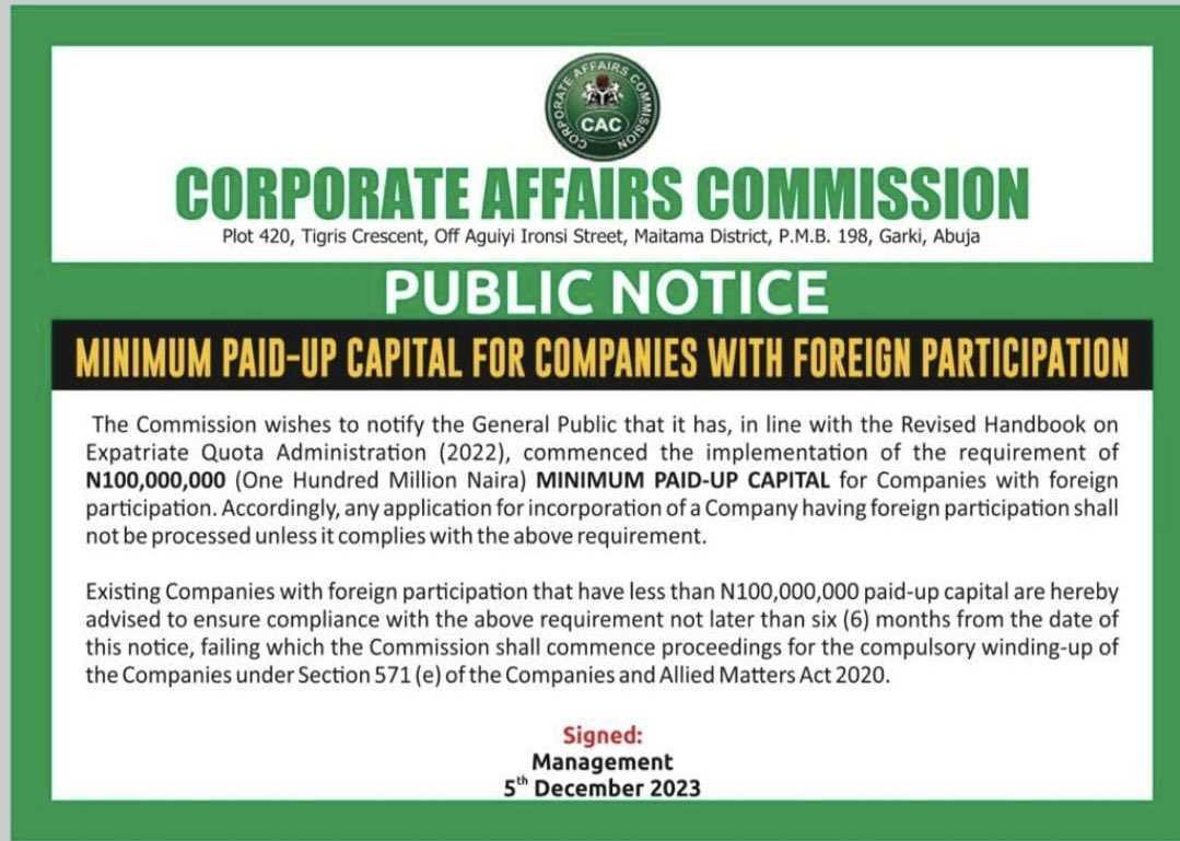 Back to the notice, the CAC has clarified that it was not “paid-up” but “issued capital” [issued share capital refers to the total shares that have been given to shareholders while paid-up share capital refers to the amount of issued share capital that has already been fully paid for]. Nonetheless, even if it did not clarify, that notice would not have affected many companies as many are well paid–up to in excess of $100k even locally. Also, the fee may not even be much (possibly less than N100,000 using recent guidance).