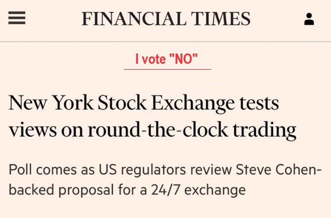 I will vote NO for this: “The New York Stock Exchange (NYSE) is considering a proposal for 24/7 stock trading, a move that mirrors the continuous trading model of the cryptocurrency market.” The grand scheme is to “keep up with the digital age… The NYSE is currently polling market participants on the merits of trading stocks around the clock, as regulators scrutinize an application for the first 24/7 bourse.”