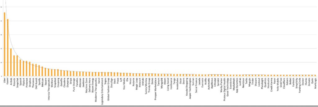 A power curve of the whole 121 unicorns shows that is concentrated at the top 20