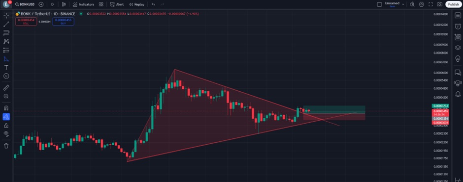 Bonk (BONK), a Solana-based meme coin, is also struggling after experiencing a price increase recently. According to the latest data, BONK has risen by more than 5% in the last 24 hours and is trading at around $0.000035, although experts are convinced the token has lost steam.