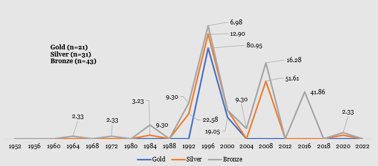Nigeria competed in 11 Olympic Games before finally winning, but her second appearance (at the 1954 Commonwealth Games) resulted in her first gold medal (see Exhibit 2). Nigeria began winning gold at the Olympics in 1996, a year in which it won a sizable amount of gold medals. Nigeria made history by being the first African nation to ever win a football-related gold medal during the year. The country, however, was unable to maintain the momentum at the games in Sydney in 2000, Beijing in 2008, and Rio in 2016. She had one of its lowest performances in 2020, winning a small number of medals (see Exhibit 3).