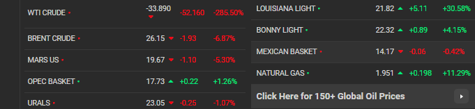 The price of West Texas Intermediate (WTI), the benchmark for U.S. oil, dropped 39.09 per cent to $10.98 a barrel on Monday.