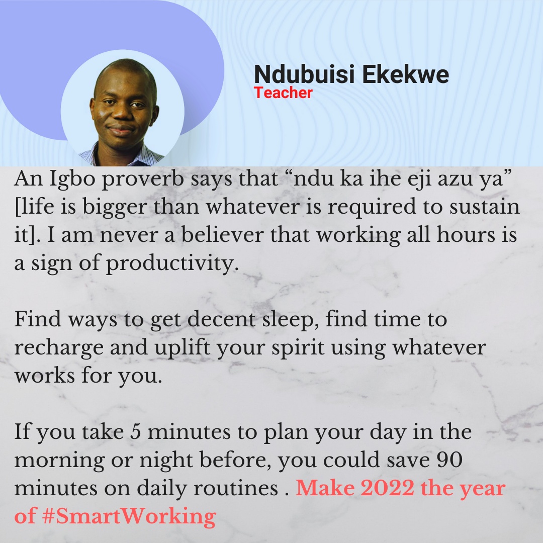 An Igbo proverb says that “ndu ka ihe eji azu ya” [life is bigger than whatever is required to sustain it]. I am never a believer that working all hours is a sign of productivity.