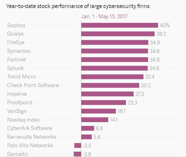 WannaCry has provided good advertising for cybersecurity companies around the world. The general constructs of cybersecurity in the last few weeks have been good for business. Symantec has jumped by around 4%, worth some $700 million in market cap. Companies like Fortinet, FireEye, Sophos, and Qualys have also jumped. F-Secure and Tokyo-listed Trend Micro also added a few percent to their share prices, worth several million dollars for each company. This is the state of the stock performances of major cybersecurity companies, according to Quartz. They are having one of the best years in a decade.